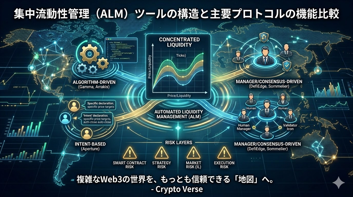 集中流動性モデルにおけるポジション管理を自動化するALMツールの仕組みと、各プロトコルの技術的アプローチ(アルゴリズム型、インテントベース型、マネージャー主導型など)の違い、および潜在する構造的なリスクを分類・理解するための情報を提供することです。