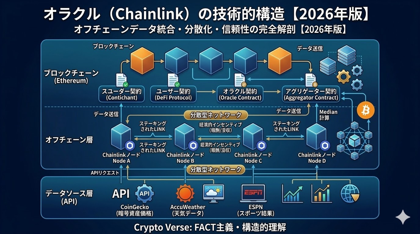 読者が表面的な「外部データを取得する仕組み」という理解に留まらず、オラクルの信頼モデル、データ検証プロセス、中央集権化リスク、経済的インセンティブ設計を技術的に理解できるようになることを目指します。