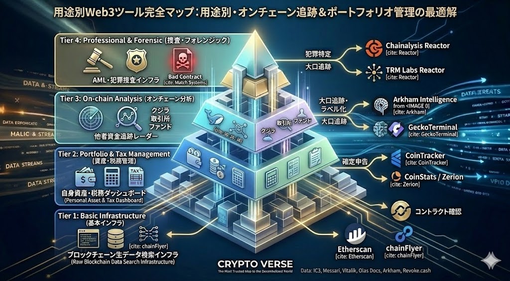 Web3エコシステムの拡大に伴い、ブロックチェーン上のデータは膨大かつ複雑化しています。投資家や法人がオンチェーン上の資金移動を正確に把握し、税務管理やリスクヘッジを行うためには、目的に特化した「ツール」の選定が不可避です。現在、市場には法執行機関が使用する高度なフォレンジック(犯罪捜査)ツールから、個人の税務計算(確定申告)を自動化するアプリまで無数のサービスが乱立しています。