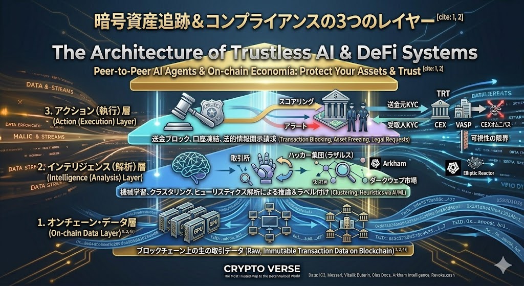 2. インテリジェンス(解析)層: ChainalysisやArkhamなどのツールが、生データに対してクラスタリングやヒューリスティクス解析を行い、「これは取引所」「これはハッカー」といった意味(タグ)を付与する推論レイヤー。