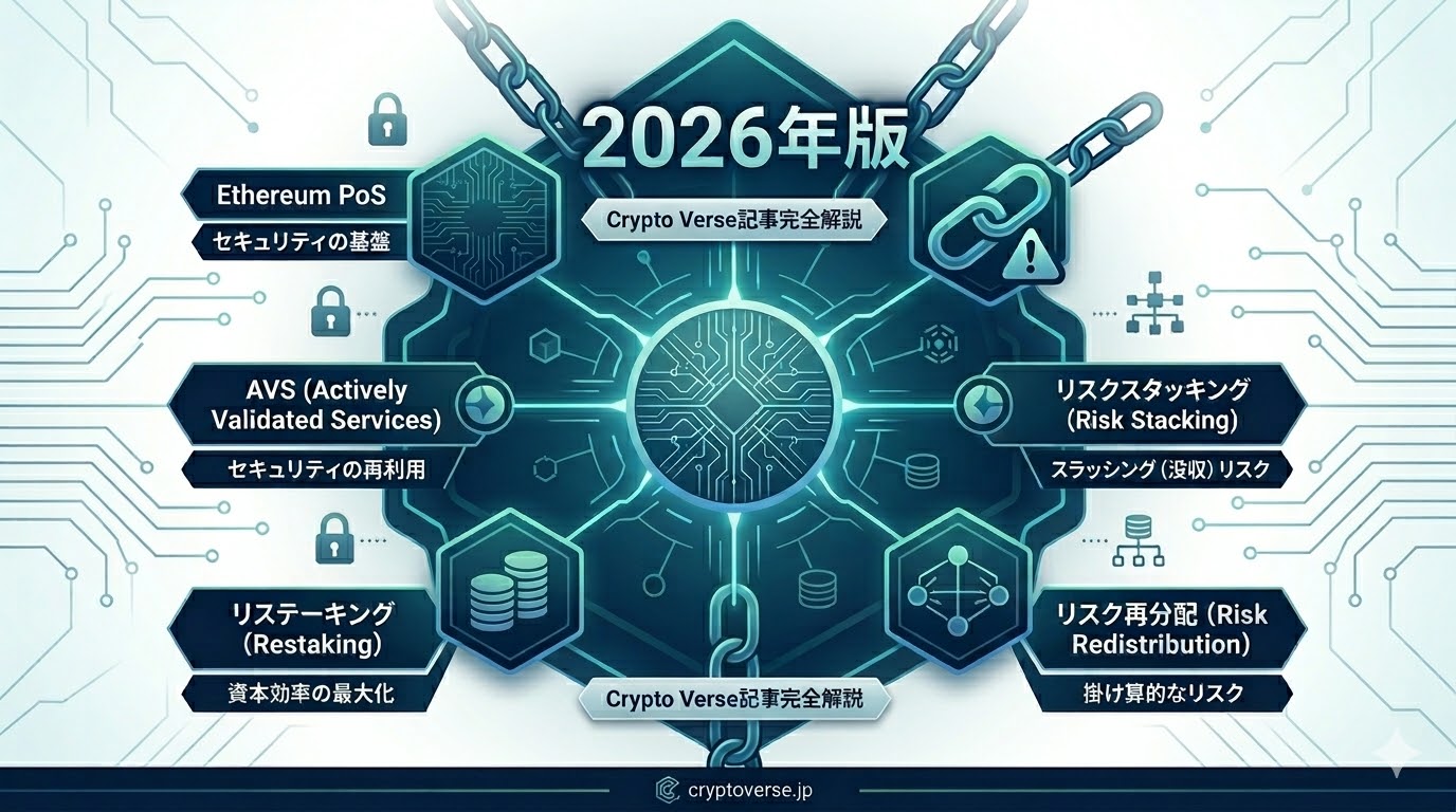 暗号資産市場において、Ethereum(イーサリアム)のProof of Stake(PoS)ネットワークに預け入れた資産(ETH)を、別のプロトコルのセキュリティ維持にも同時に流用する「再ステーキング(Restaking)」という技術的アプローチが拡大しています。この分野を主導するEigenLayer(アイゲンレイヤー)は、Ethereumの巨大な経済的セキュリティを他の開発者が「間借り」できる仕組みを構築し、2026年3月時点で約110億ドル以上の総預入資産(TVL)を集めています(DeFiLlamaデータ)。しかし、この資本効率の劇的な向上は、同時に「1つの資産が複数のシステムで没収(スラッシング)されるリスクを負う」という、Web3における複雑な「リスク再分配モデル」を生み出しています。本記事では、再ステーキングのメカニズム、AVS(Actively Validated Services)の構造、そしてDeFi市場に内在するシステミックリスクを客観的事実に基づいて解剖します。