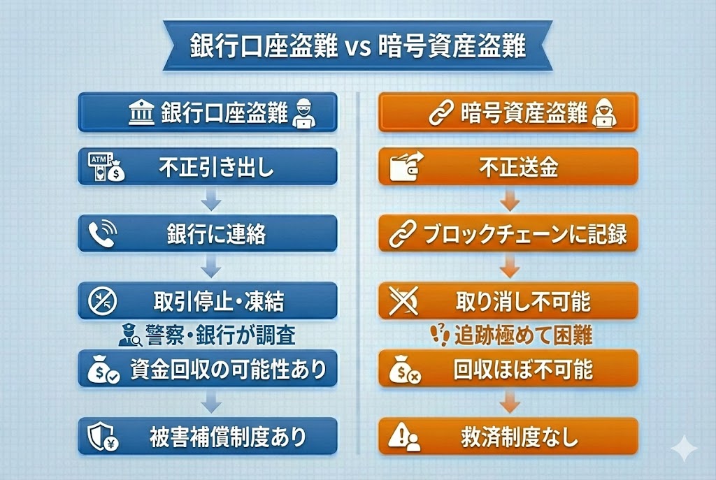 暗号資産の盗難は、銀行口座のハッキングとは本質的に異なります