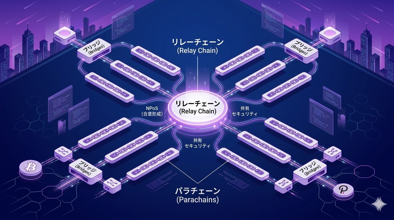 ポルカドット(Polkadot)は、異なるブロックチェーン間の相互運用性を実現するマルチチェーンプラットフォームである。本記事では、リレーチェーン、パラチェーン、ブリッジという3層構造の技術アーキテクチャについて、公式ドキュメントおよび2026年3月時点の検証可能な情報に基づき、暗号資産・ブロックチェーン初心者向けに解説する。